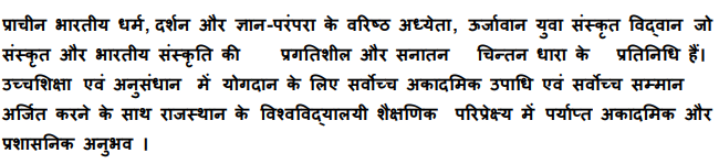 and Sahityacharya, he joined as Lecturer in Sanskrit in DAV College, Pehowa in 1988 and joined as Associate Professor in Department of Sanskrit in 2007 and was promoted as Professor in 2010. Since then he has been member of UG and PG board of studies in various Universities, has delivered lectures as resource person in different colleges and has attended many seminars and conferences. He has guided more then 10 phd students and has achieved many awards for his research contribution in the field of Sanskrit Literature. Recently he has been awarded with Vedavyas Samman (2018) for his book. Along with this he is a humble person and a very good teacher.