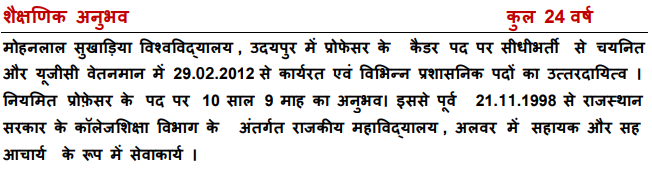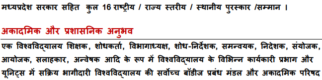 विभाग के प्रोफेसर के रूप में सेवानिवृत्त हुए हैं। आपका 35 वर्षों का शैक्षणिक अनुभव है अपने अध्ययन काल में यूजीसी एवं सीएसआईआर से आपको शोधवृत्ति (Fellowship) प्राप्त हुई है। आपके निर्देशन में पीएचडी एवं पीडीएफ के 21 शोधार्थियों ने शोधकार्य पूर्ण किया है। राष्ट्रीय और अंतरराष्ट्रीय रिसर्च जर्नल में आपके 60 शोधपत्र प्रकाशित हुए हैं। विविध विषयों पर आपकी 04 पुस्तकें भी प्रकाशित हैं।