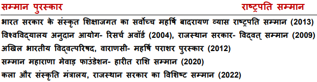 For his outstanding and promising presence in these fields of studies, he has been conferred with many awards amongst which Presidents of India award – “Badarayan Vyasa Samman” and “Kalidasa Sammana”(Uttar Paradesh Sanskrit Sansthan) are notable. Currently has been working on 2 projects sponsored by Indian Council for Social Sciences Research (ICSSR)- Mind, Morality and Motives : Learning from Indian Tradition” and “Indo-Iranian Cognate Glossary”. He has also been a Fellow at Indian Institute of Advanced Study, Shimla, and worked on the project - प्राकृत कविता के चारुत्व के भाषिक प्रयोजक.
